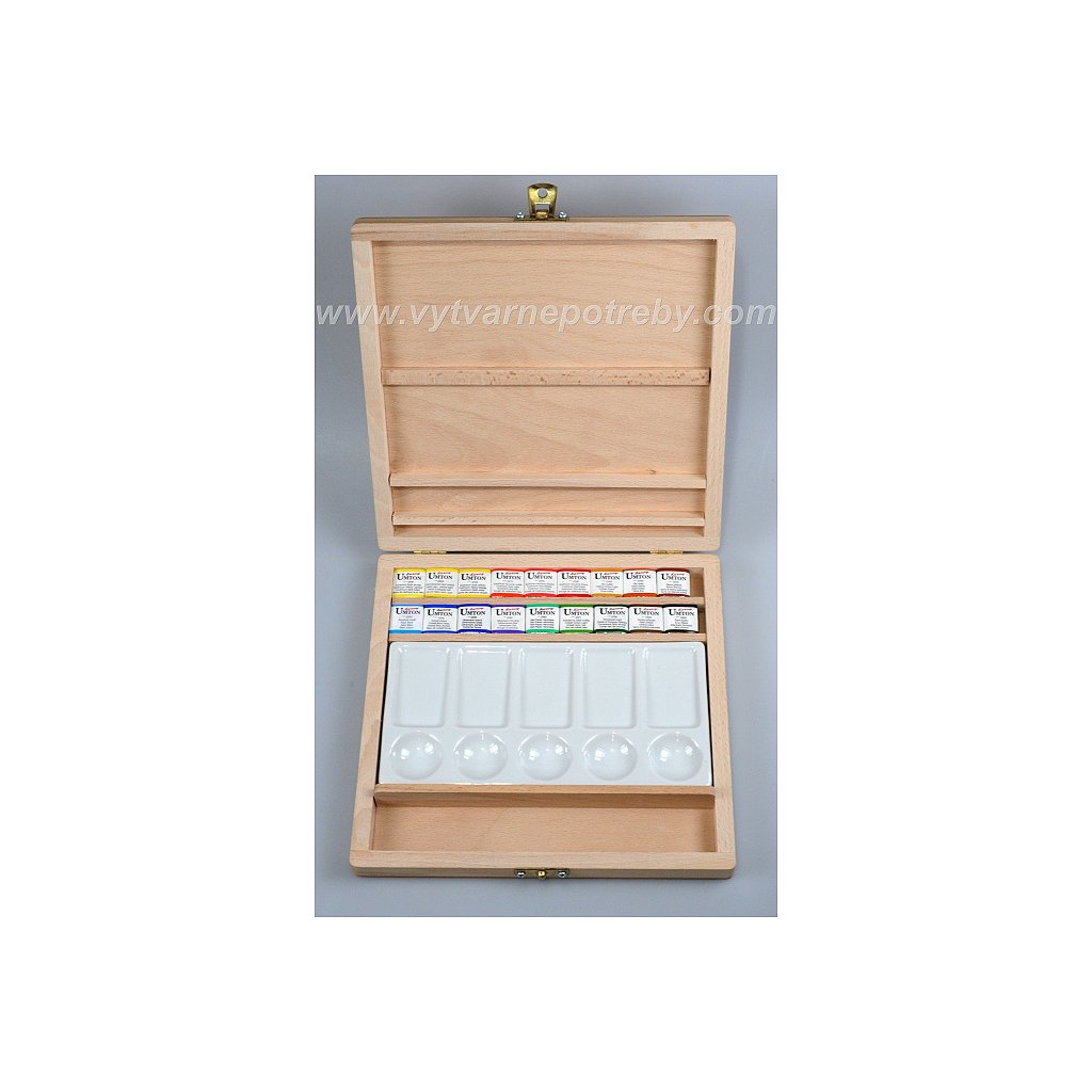 Dárková sada akvarelových barev ve dřevěné kazetě s keramickou paletou.