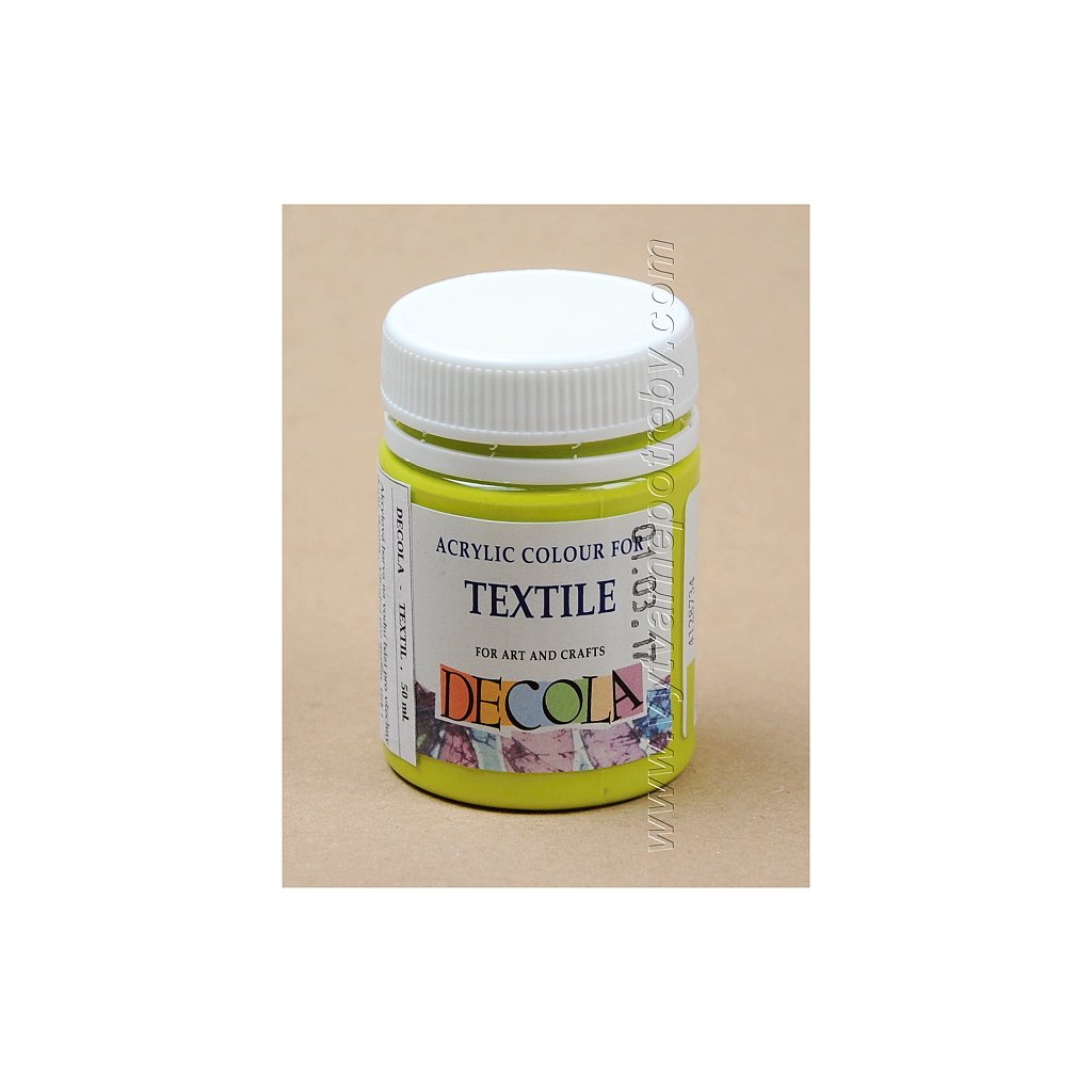 Akrylová barva na světlý i tmavý textil. Barvy DECOLA TEXTILE mají objem 50 ml., jsou navzájem míchatelné, vhodné pro malbu štětcem, válečkem i razítkování. V nabídce je 29 základních , 9 perleťových, 7 fluorescentních a 3 metalické odstíny.| Kategorie: | Akrylové |
