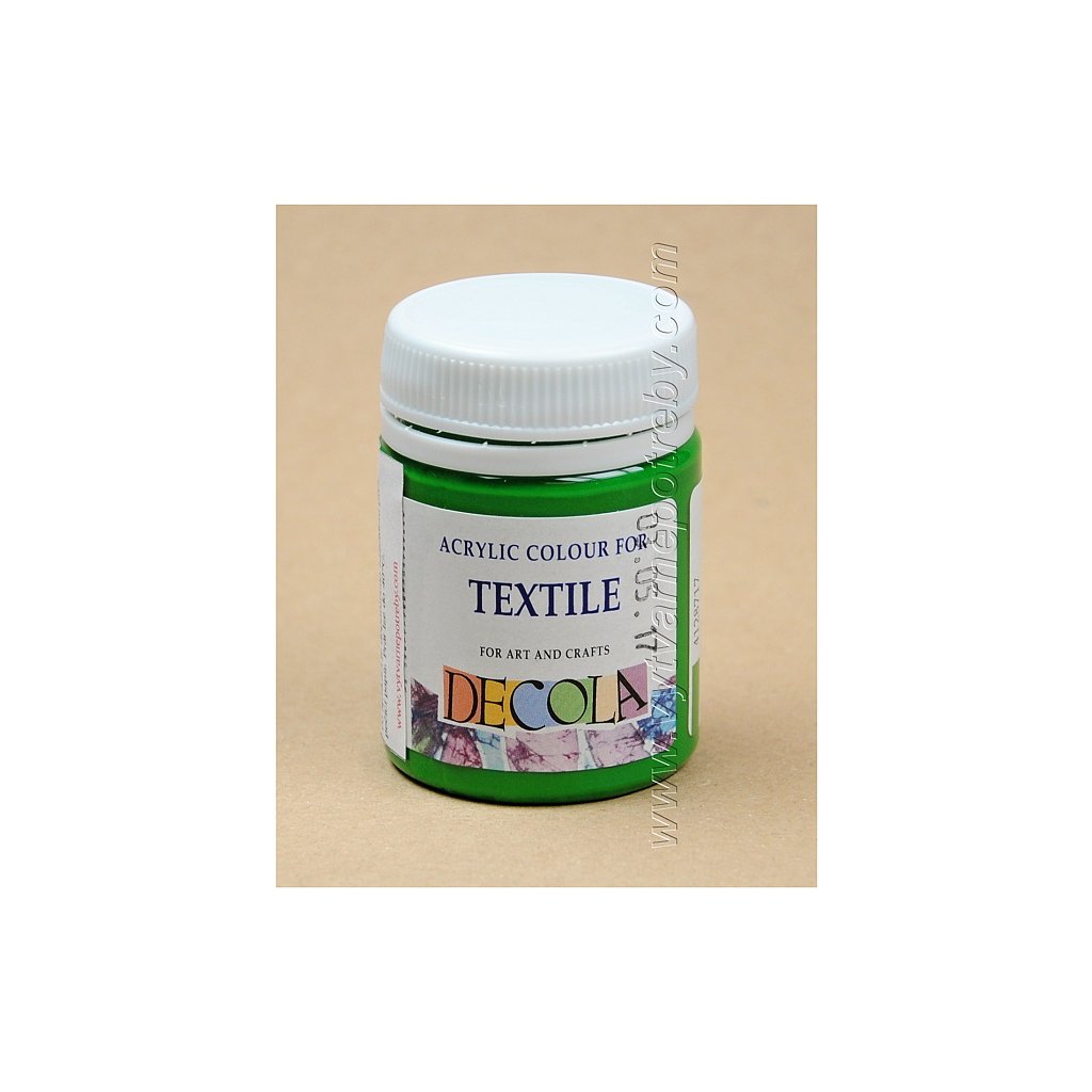 Akrylová barva na světlý i tmavý textil. Barvy DECOLA TEXTILE mají objem 50 ml., jsou navzájem míchatelné, vhodné pro malbu štětcem, válečkem i razítkování. V nabídce je 29 základních , 9 perleťových, 7 fluorescentních a 3 metalické odstíny.| Kategorie: | Barvy na textil |
