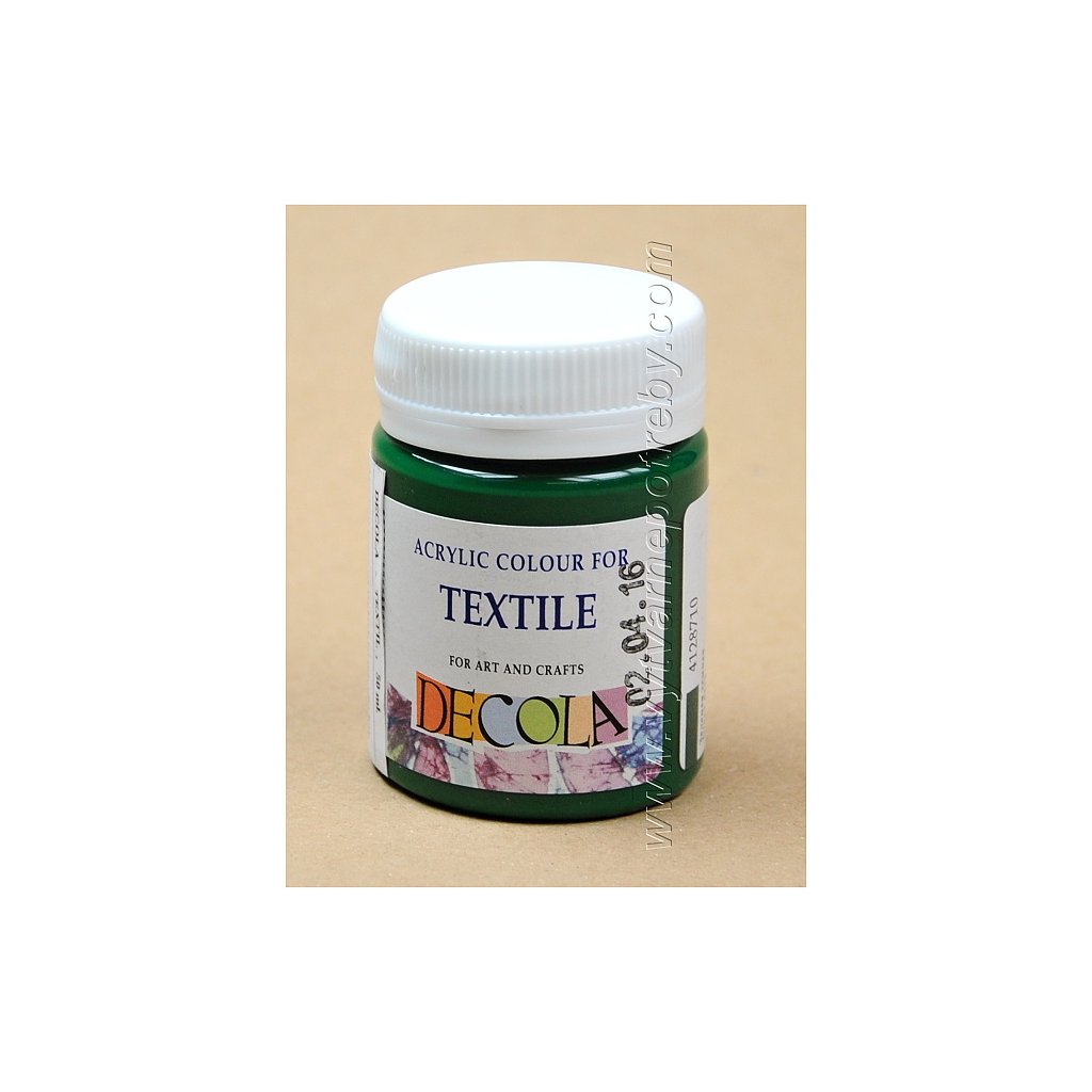 Akrylová barva na světlý i tmavý textil. Barvy DECOLA TEXTILE mají objem 50 ml., jsou navzájem míchatelné, vhodné pro malbu štětcem, válečkem i razítkování. V nabídce je 29 základních , 9 perleťových, 7 fluorescentních a 3 metalické odstíny.| Kategorie: | Barvy na textil |