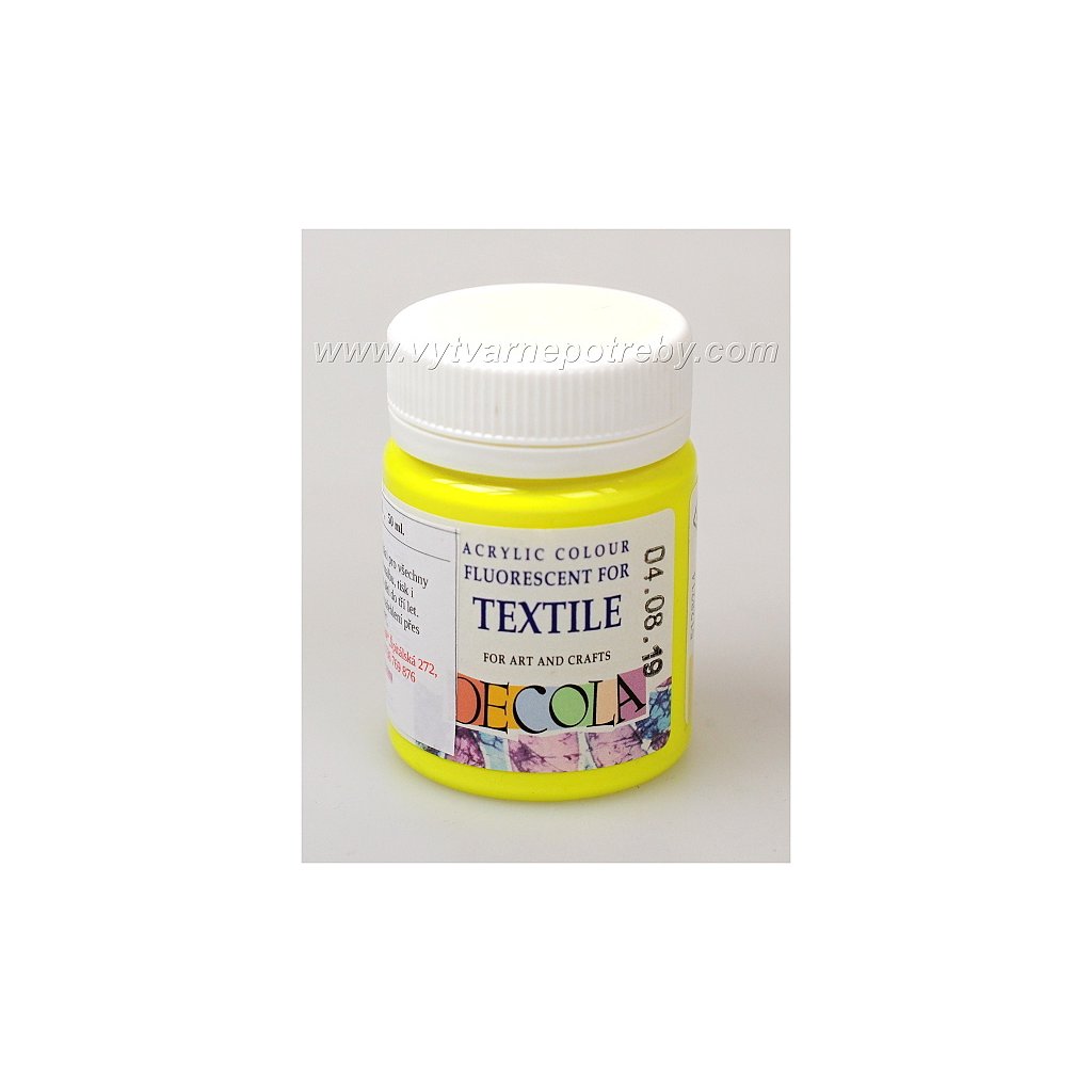Akrylová barva na světlý i tmavý textil. Barvy DECOLA TEXTILE mají objem 50 ml., jsou navzájem míchatelné, vhodné pro malbu štětcem, válečkem i razítkování. V nabídce je 29 základních , 9 perleťových, 7 fluorescentních a 3 metalické odstíny.| Kategorie: | Akrylové |