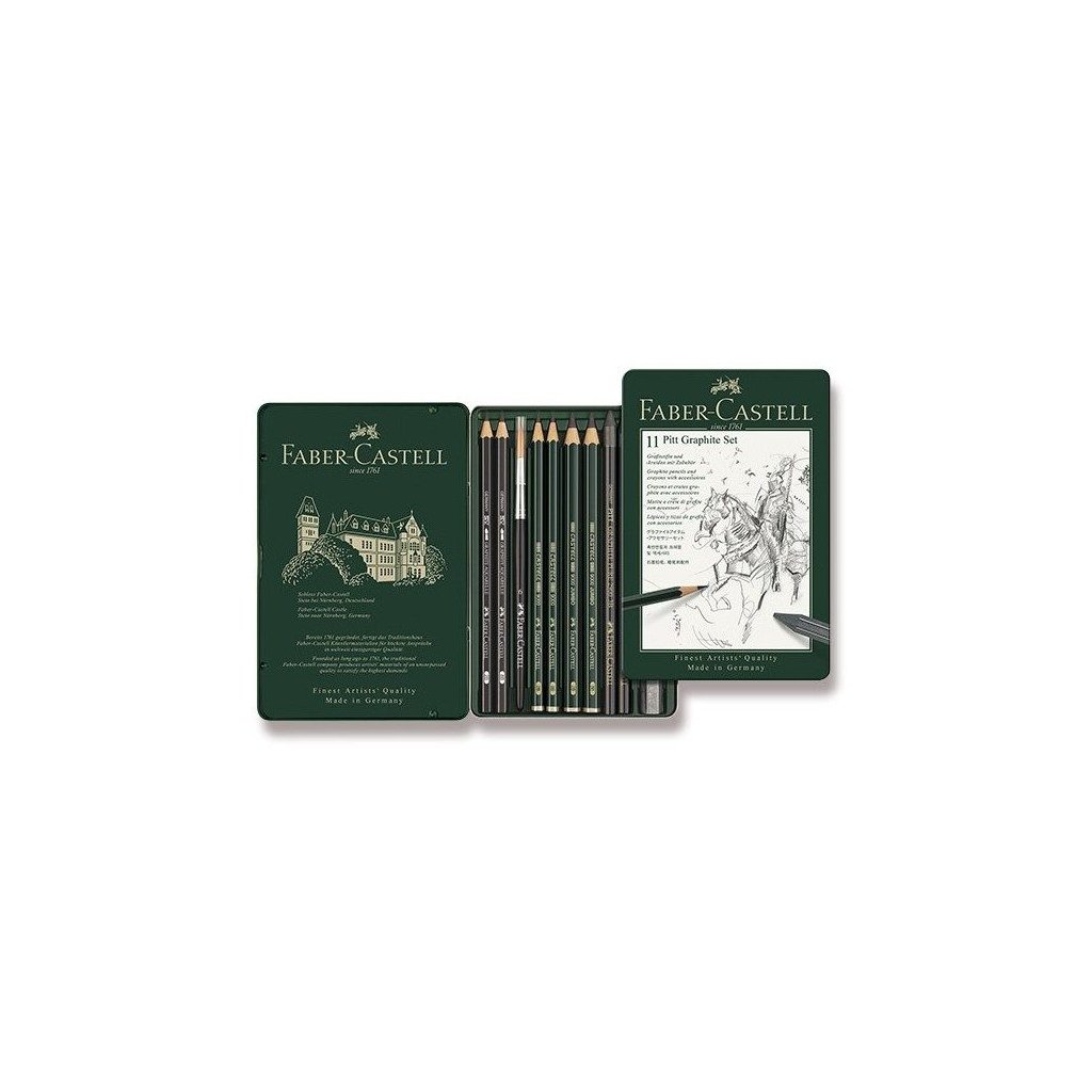 Balení grafitových tužek Faber-Castell. Obsahuje 9 grafitových tužek - 2x JUMBO, 2x Aqarelle 2B a 6B , 2x Pure ( Progresso) 3B a 6B , Grafitovou tuhu 6B, pryž štětec.