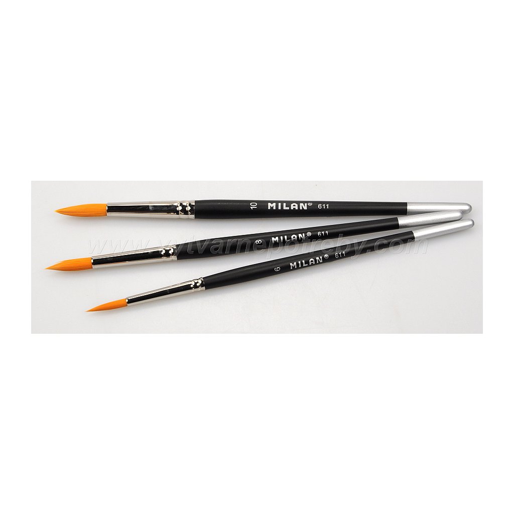 Štětce Milan série 611 jsou umělecké kulaté štětce se syntetickým vláknem Toray. Vyznačují se jemným , ale dostatečně pružným vláknem vhodným pro různé techniky malby. Mají krátké černě lakovné držátko a bezešvou niklovanou zděř. Štětce vemi dobře drží svůj tvar , nevypadávají.| Kategorie: | Umělecký |